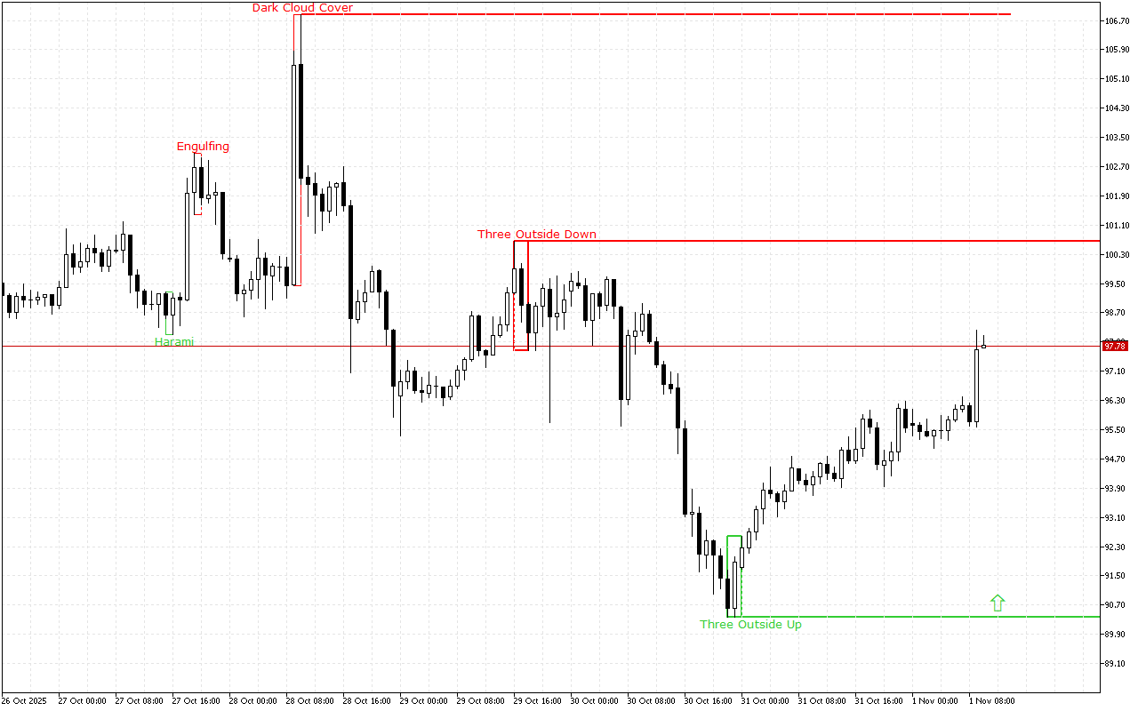 Моделът, образуван тук, е Три външни ленти надолу. Този модел е комбинация от три японски свещника. Първият свещник има късо бяло истинско тяло, вторият свещник има дълго черно истинско тяло и напълно поглъща първия свещник, а третият свещник също е черен, затваряйки се под втория свещник.