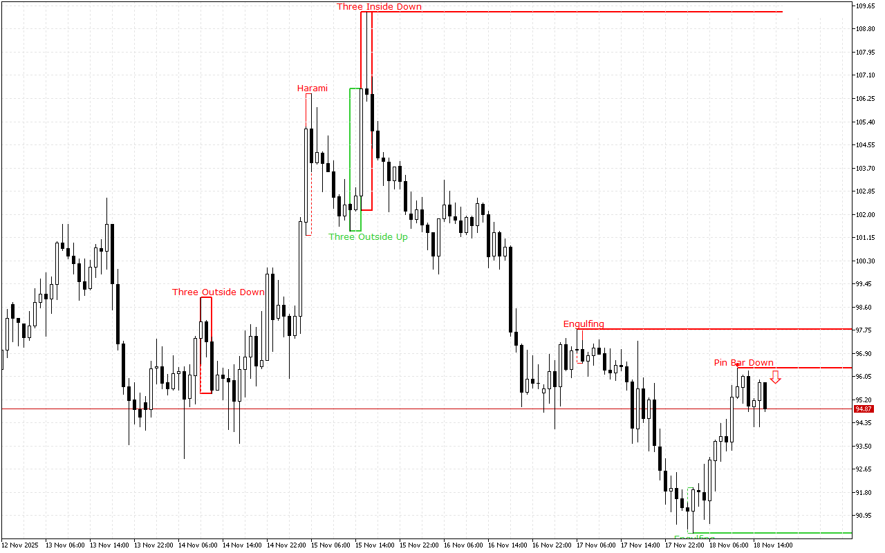 Последният модел, формиран на графиката, дава приоритет на късите позиции. Този сигнал също се поддържа от динамиката на движението на цената на по-високата времева рамка.