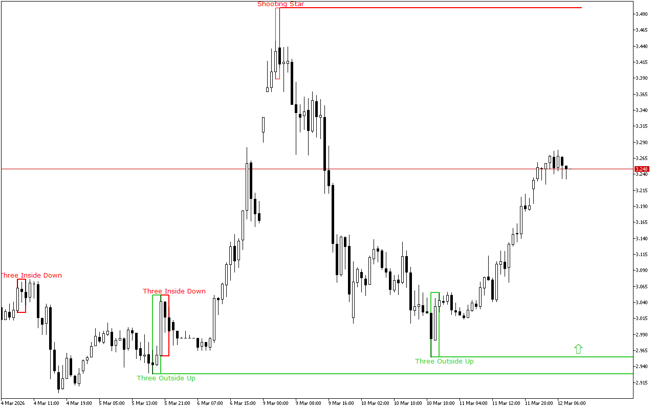 Бул жерде Morning Doji Star үлгүсү калыптанган. Бул үлгү үч жапон шам чырактарынын айкалышынан турат. Диаграммада бул үлгүнүн көрүнүшү баалардын өзгөрүү ыктымалдыгын олуттуу жогорулатат.