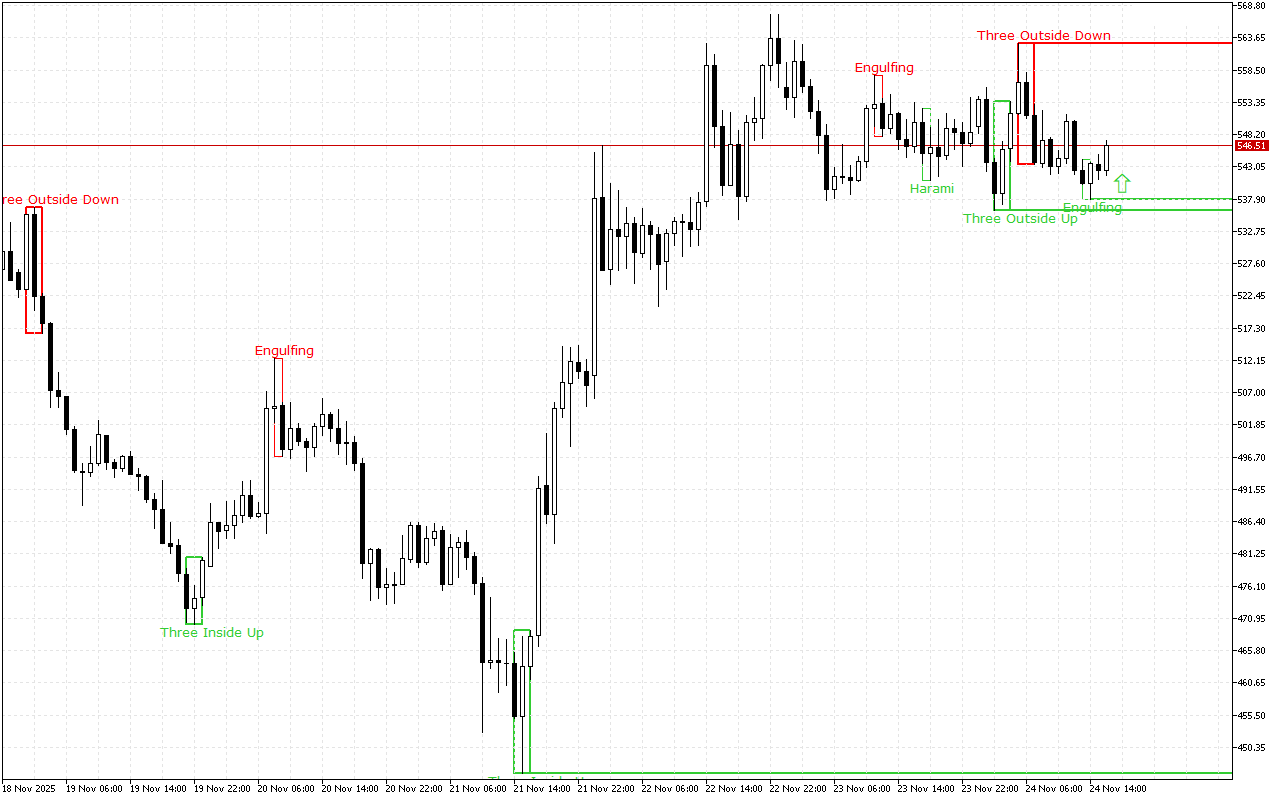 Бул деңгээл Bullish Engulfing үлгүсү менен түзүлгөн. Үлгү эки шамдан турат: биринчиси экинчисинин корпусунун ичинде, ал кыйла чоңураак. Экинчи шам биринчисин толугу менен каптайт.