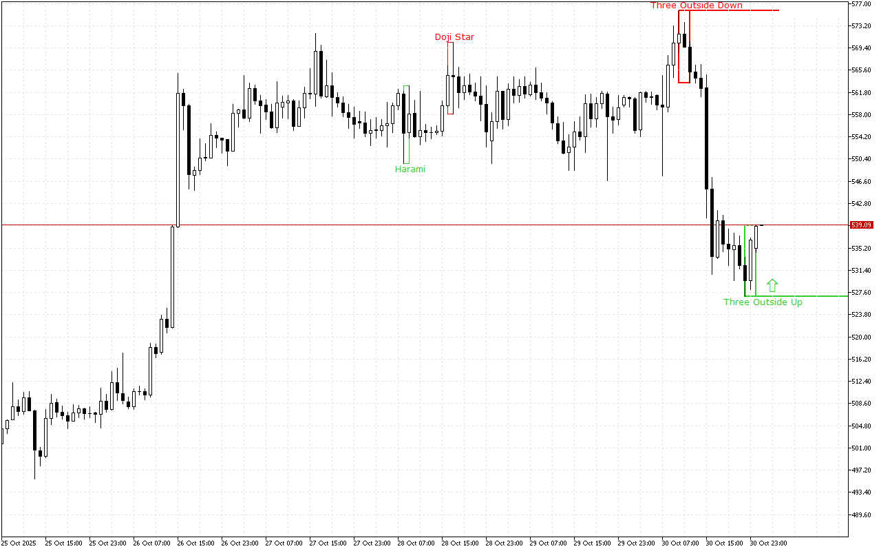 Бул жерде калыптанган үлгү Үч Тышкы тилке ылдый болуп саналат. Бул үлгү үч жапон шамдын айкалышы болуп саналат. Биринчи шамдын кыска ак чыныгы денеси бар, экинчи шамдын узун кара чыныгы денеси бар жана биринчи шамды толугу менен жалмап алат, үчүнчү чыракчы да кара, экинчи шамдын астына жабылат.