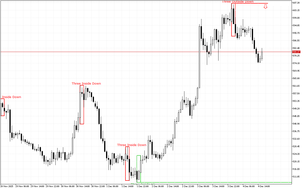 Бул жерде калыптанган үлгү Үч Тышкы тилке ылдый болуп саналат. Бул үлгү үч жапон шамдын айкалышы болуп саналат. Биринчи шамдын кыска ак чыныгы денеси бар, экинчи шамдын узун кара чыныгы денеси бар жана биринчи шамды толугу менен жалмап алат, үчүнчү чыракчы да кара, экинчи шамдын астына жабылат.