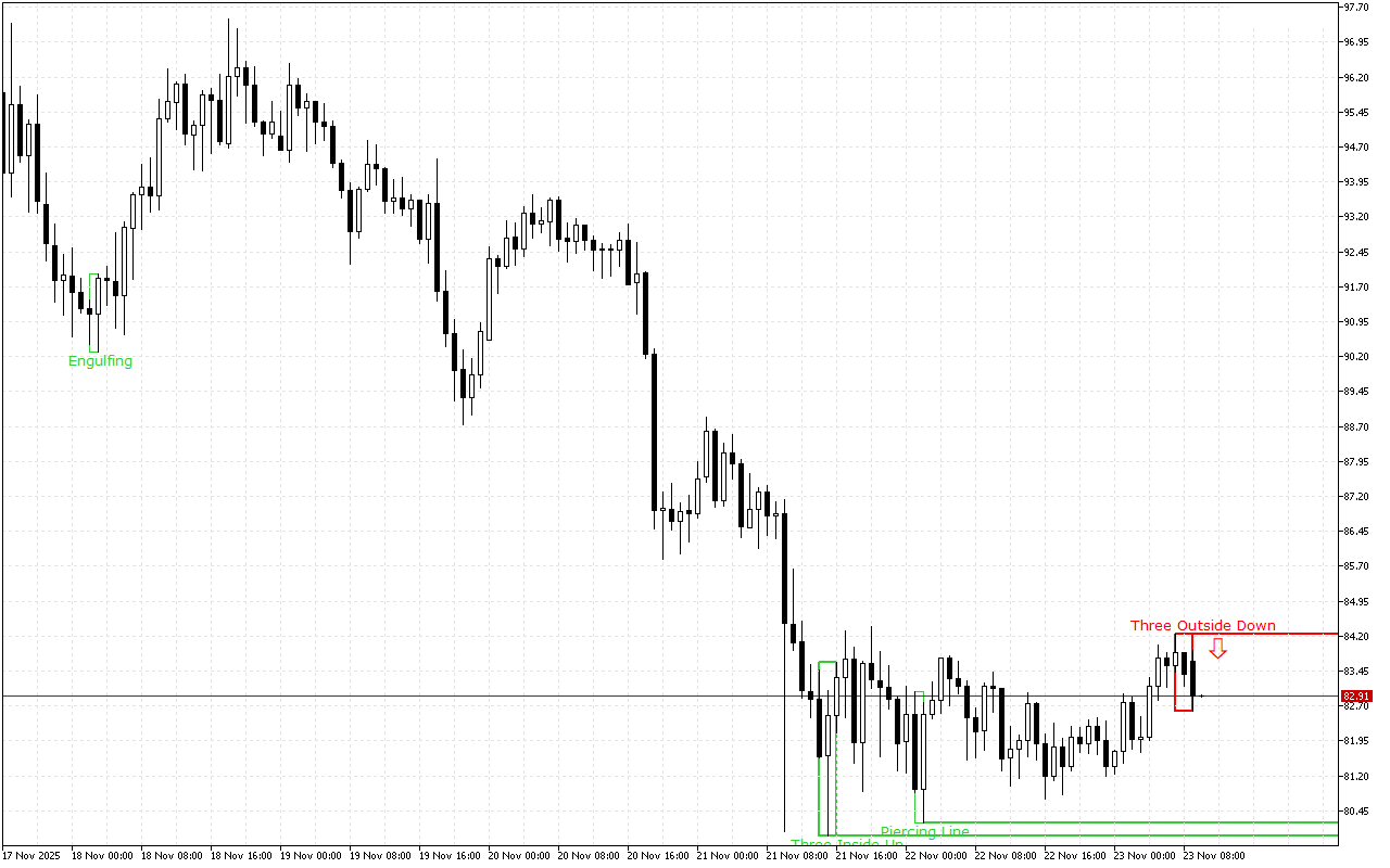 Vzor zde vytvořený je Three Outside Bars Down. Tento vzor je kombinací tří japonských svícnů. První svícen má krátké bílé skutečné tělo, druhý svícen má dlouhé černé skutečné tělo a zcela pohltí první svícen a třetí svícen je rovněž černý a uzavírá se pod druhým svícnem.