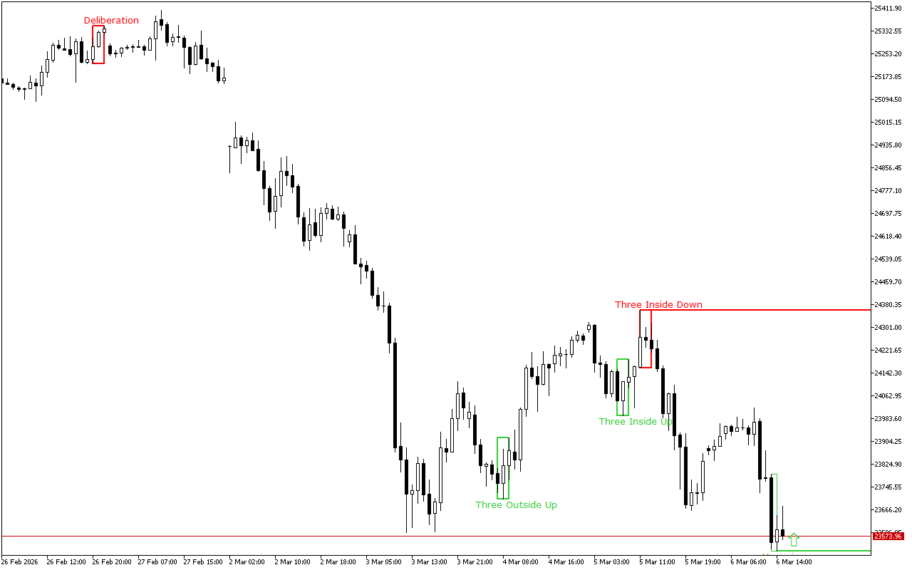 Tato úroveň byla tvořena vzorem Three Outside Bars Up. Vzor se skládá ze tří japonských svícnů: první svícen má krátké černé skutečné tělo, druhý svícen má dlouhé bílé skutečné tělo a zcela pohlcuje první svícen a třetí svícen je rovněž bílý a zavírá nad druhým svícnem.