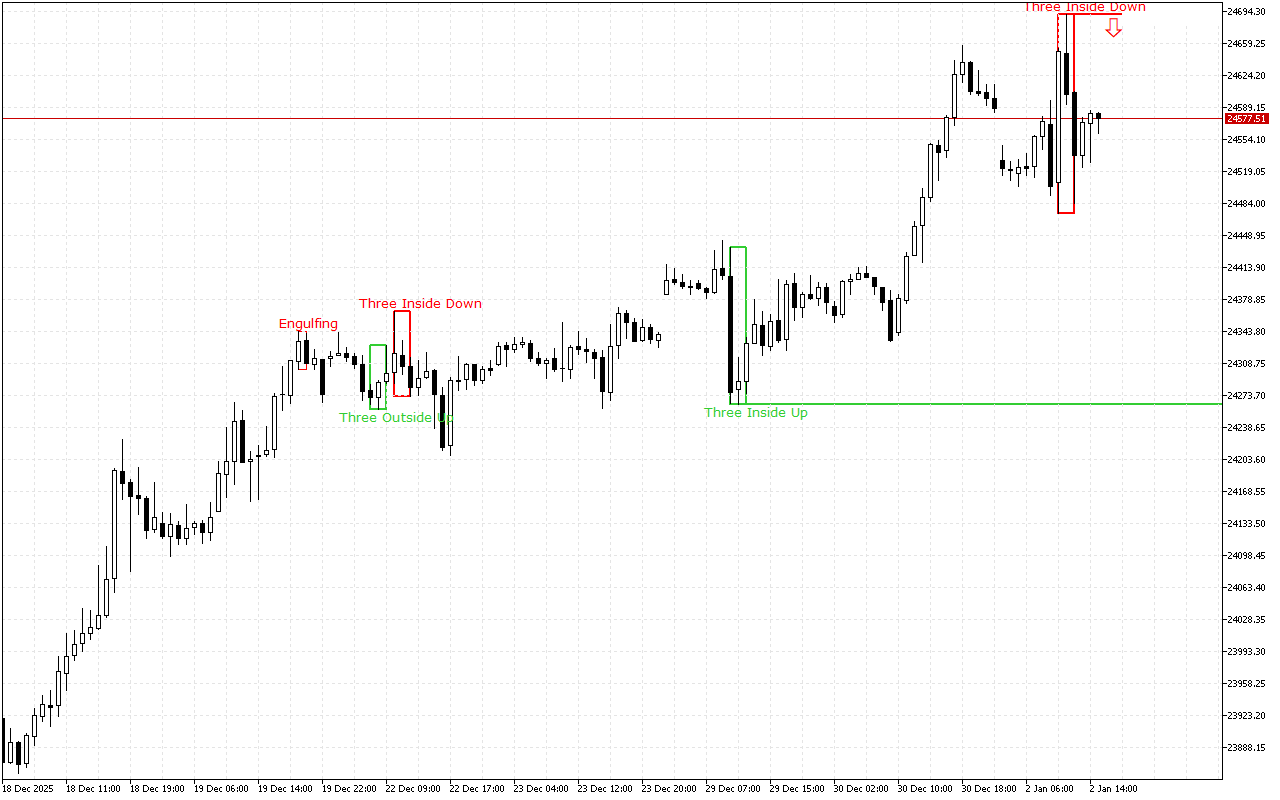 Бул деңгээл Three Inside Down үлгүсү менен түзүлгөн. Бул үлгү үч жапон шамынан турат: биринчи шамдын кыска кара чыныгы денеси бар, экинчи шамдын да кара чыныгы денеси бар жана толугу менен биринчи шамдын корпусунун ичинде, үчүнчү шам да кара жана дененин астынан жабылат. экинчи шамдын.