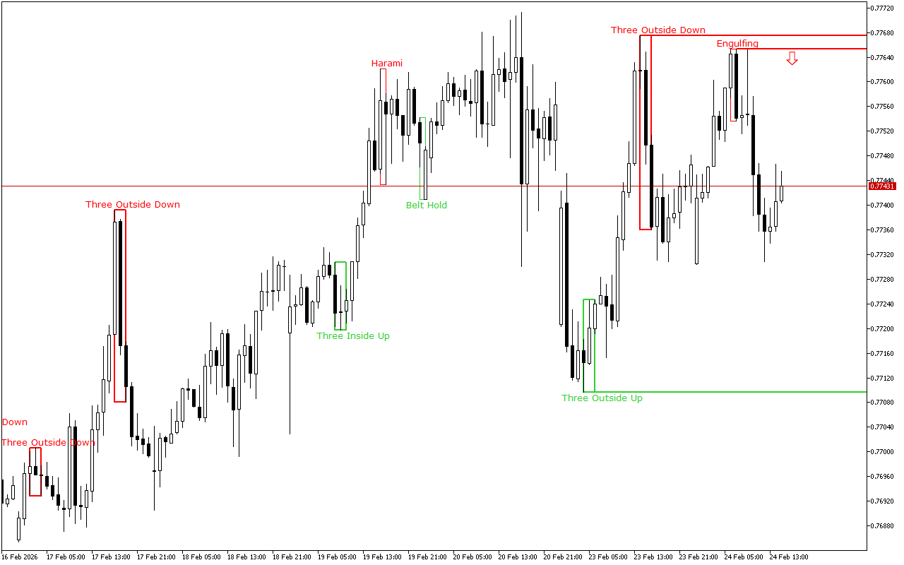 Бул жерде калыптанган үлгү Үч Тышкы тилке ылдый болуп саналат. Бул үлгү үч жапон шамдын айкалышы болуп саналат. Биринчи шамдын кыска ак чыныгы денеси бар, экинчи шамдын узун кара чыныгы денеси бар жана биринчи шамды толугу менен жалмап алат, үчүнчү чыракчы да кара, экинчи шамдын астына жабылат.