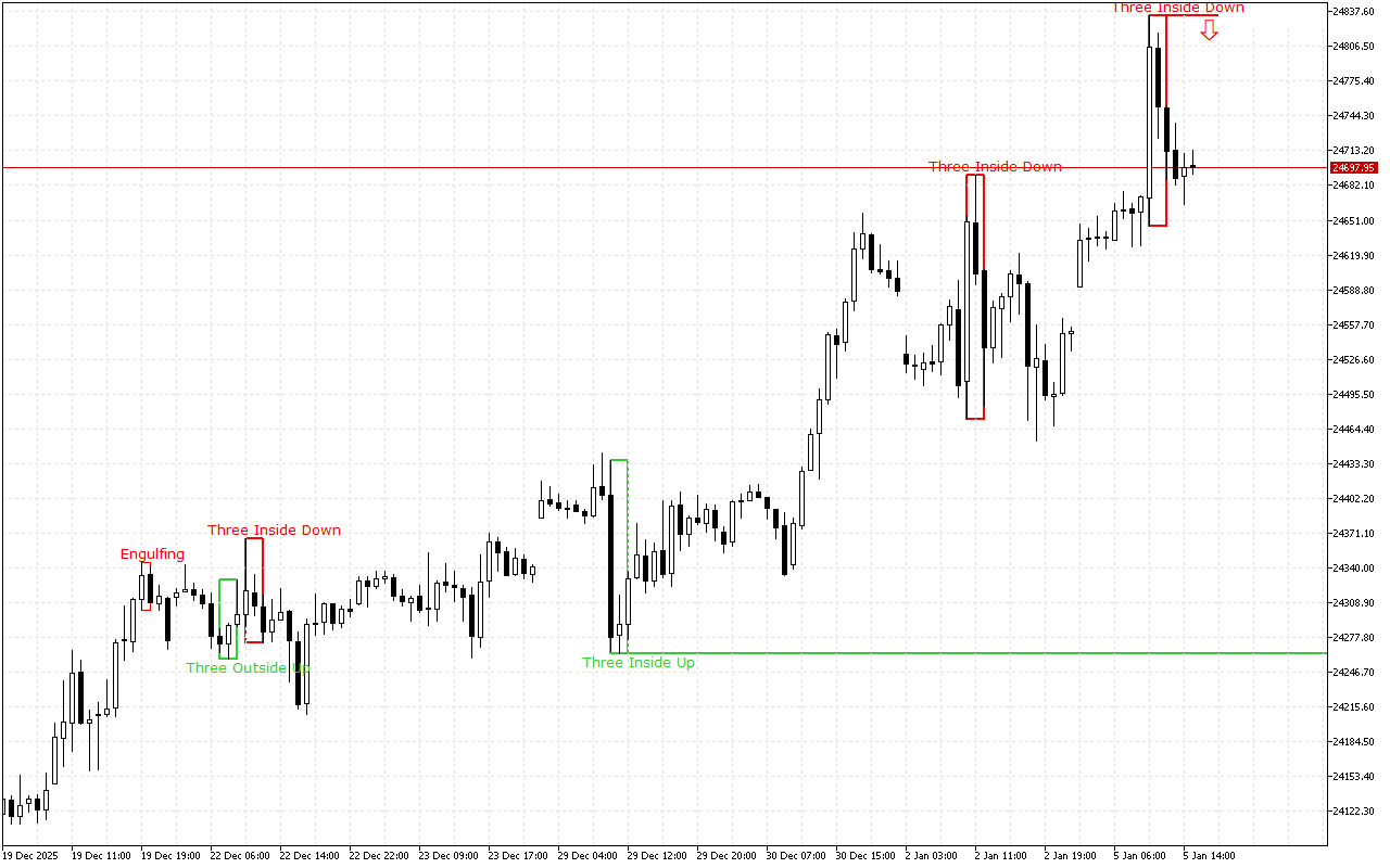 Бул деңгээл Three Inside Down үлгүсү менен түзүлгөн. Бул үлгү үч жапон шамынан турат: биринчи шамдын кыска кара чыныгы денеси бар, экинчи шамдын да кара чыныгы денеси бар жана толугу менен биринчи шамдын корпусунун ичинде, үчүнчү шам да кара жана дененин астынан жабылат. экинчи шамдын.