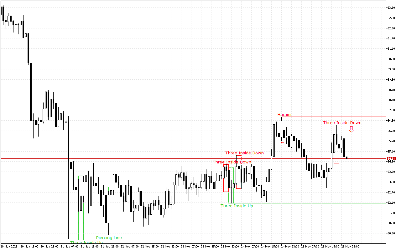 Бул деңгээл Three Inside Down үлгүсү менен түзүлгөн. Бул үлгү үч жапон шамынан турат: биринчи шамдын кыска кара чыныгы денеси бар, экинчи шамдын да кара чыныгы денеси бар жана толугу менен биринчи шамдын корпусунун ичинде, үчүнчү шам да кара жана дененин астынан жабылат. экинчи шамдын.