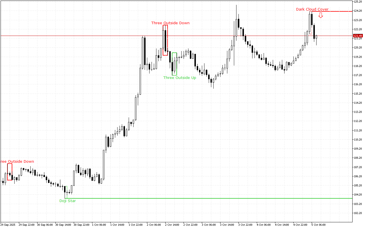 Bullish Doji Star үлгүсү бул жерде калыптанган. Бул үлгү эки жапон шамдын айкалышы болуп саналат. Биринчи шам узун чыныгы тулкулуу, ал эми экинчи шам догжи болуп саналат, ал боштук менен ачылат.