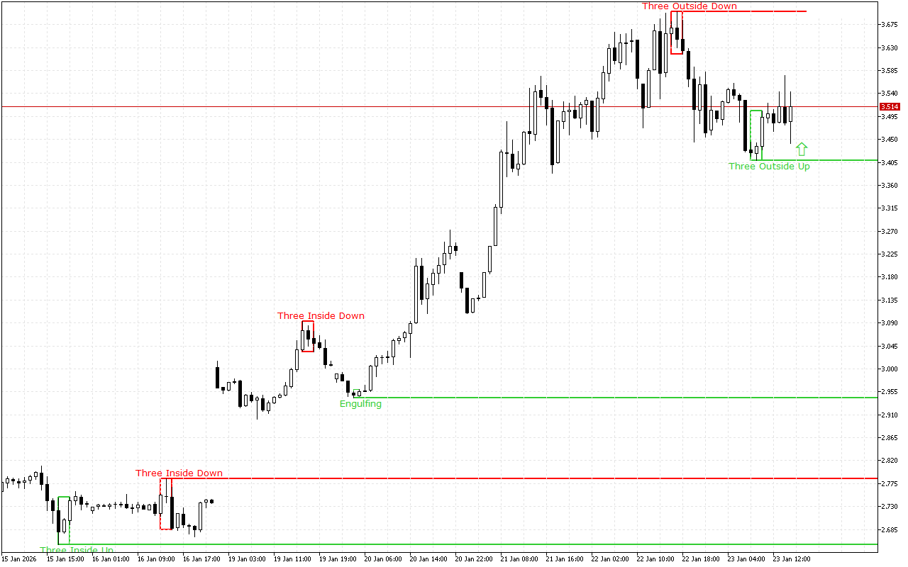Бул жерде калыптанган үлгү Үч Тышкы тилке ылдый болуп саналат. Бул үлгү үч жапон шамдын айкалышы болуп саналат. Биринчи шамдын кыска ак чыныгы денеси бар, экинчи шамдын узун кара чыныгы денеси бар жана биринчи шамды толугу менен жалмап алат, үчүнчү чыракчы да кара, экинчи шамдын астына жабылат.