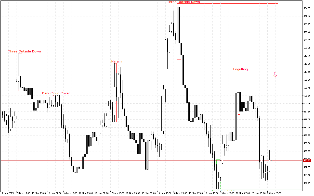 Паттерн «Медвежье поглощение» сформировал этот уровень. Он состоит из двух японских свечей: первая свеча находится внутри тела второй свечи.