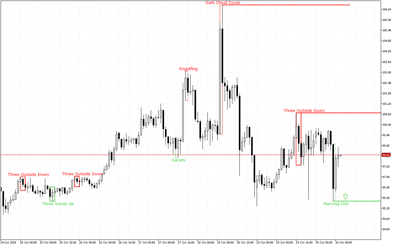 Здесь сформировался паттерн «Три внешних бара вниз», представляющий собой комбинацию из трёх японских свечей. Первая свеча имеет короткое белое тело, вторая свеча — длинная чёрная, которая полностью поглощает первую свечу, и третья свеча — также чёрная, закрывающаяся ниже второй свечи.