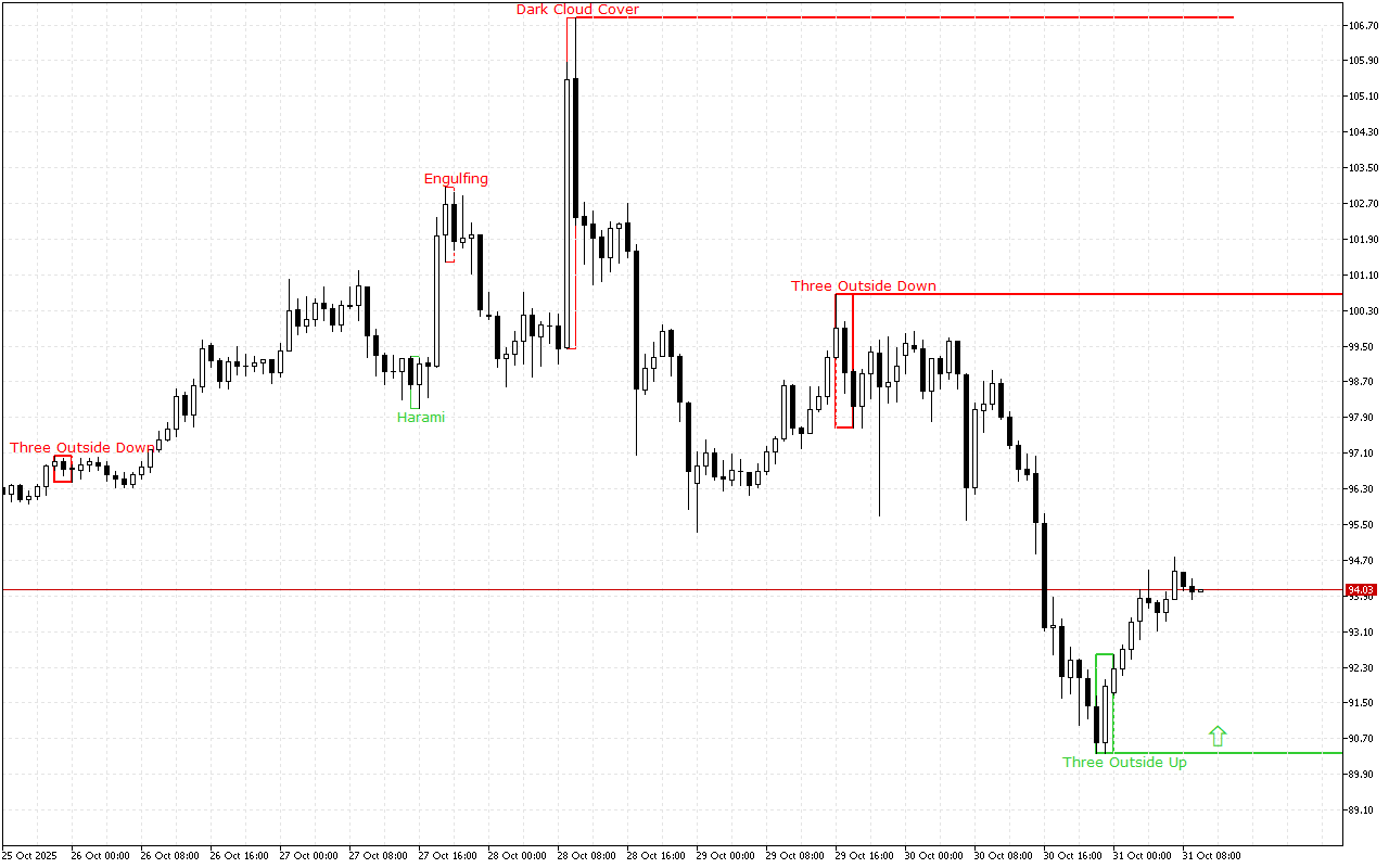 Vzor, ktorý sa tu vytvoril, sú tri vonkajšie pruhy dole. Tento vzor je kombináciou troch japonských svietnikov. Prvý svietnik má krátke biele skutočné telo, druhý svietnik má dlhé čierne skutočné telo a úplne pohltí prvý svietnik a tretí svietnik je tiež čierny, uzatvára sa pod druhým sviečkom.