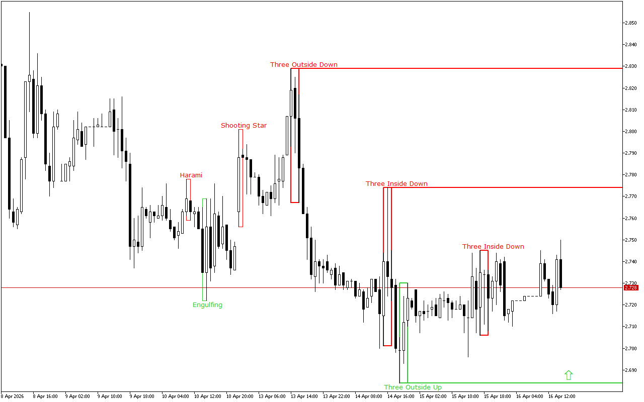 Vzor, ktorý sa tu vytvoril, sú tri vonkajšie pruhy dole. Tento vzor je kombináciou troch japonských svietnikov. Prvý svietnik má krátke biele skutočné telo, druhý svietnik má dlhé čierne skutočné telo a úplne pohltí prvý svietnik a tretí svietnik je tiež čierny, uzatvára sa pod druhým sviečkom.