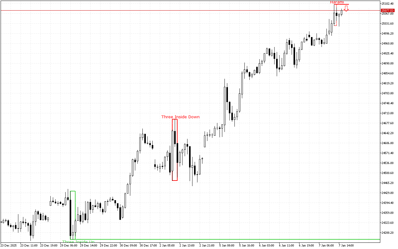 To raven je oblikoval vzorec Three Inside Up. Ta vzorec je sestavljen iz treh japonskih sveč: prva sveča ima kratko belo pravo telo, druga sveča ima belo pravo telo in je popolnoma znotraj telesa prve sveče, tretja sveča pa je prav tako bela in se zapira nad telesom sveče. drugo svečo.