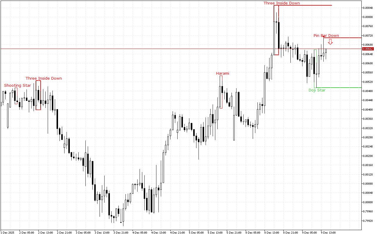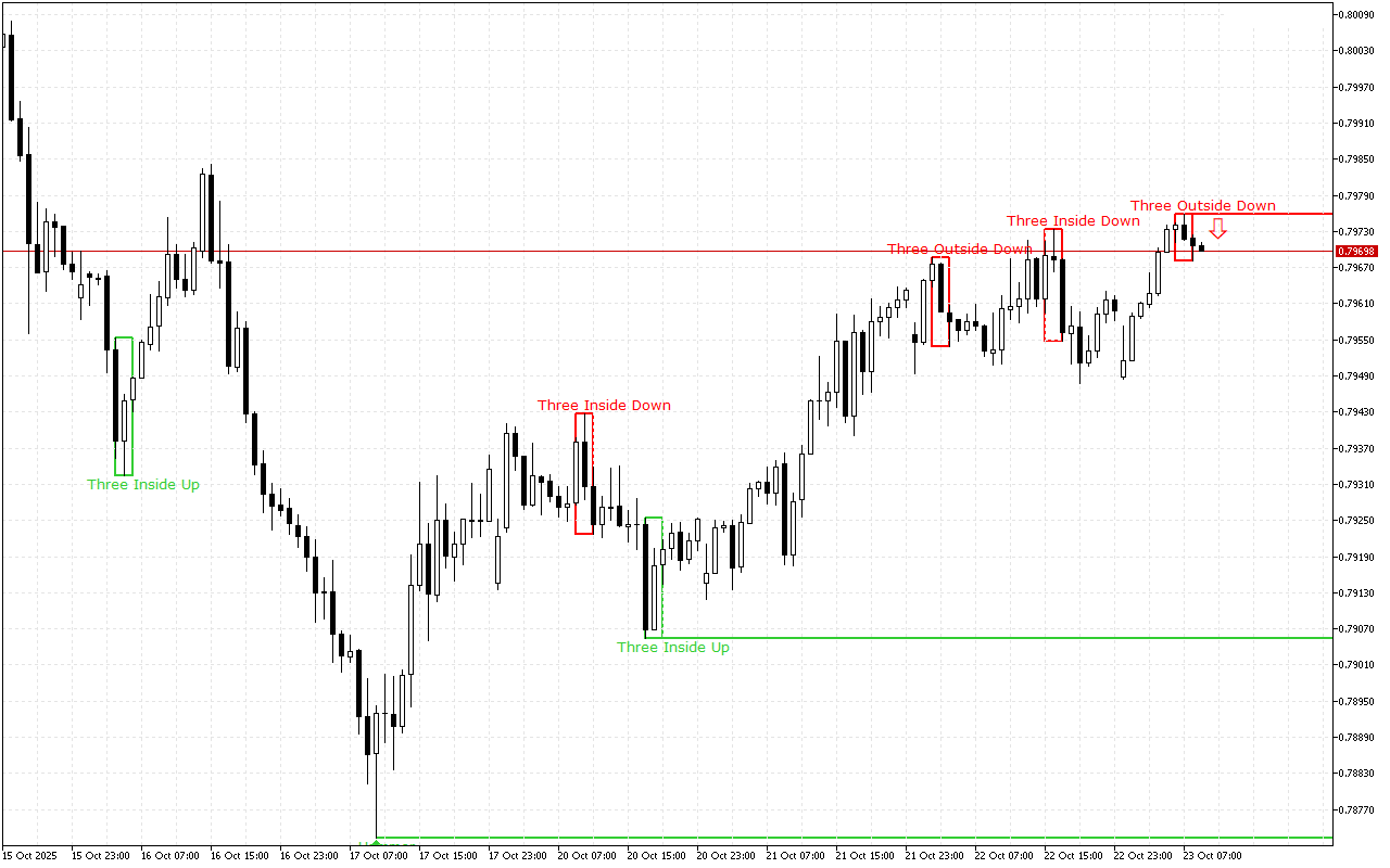 Vzorec Three Inside Down kaže na obrat cene navzdol. Toda verjetnost potrditve v praksi ni večja od 60%.