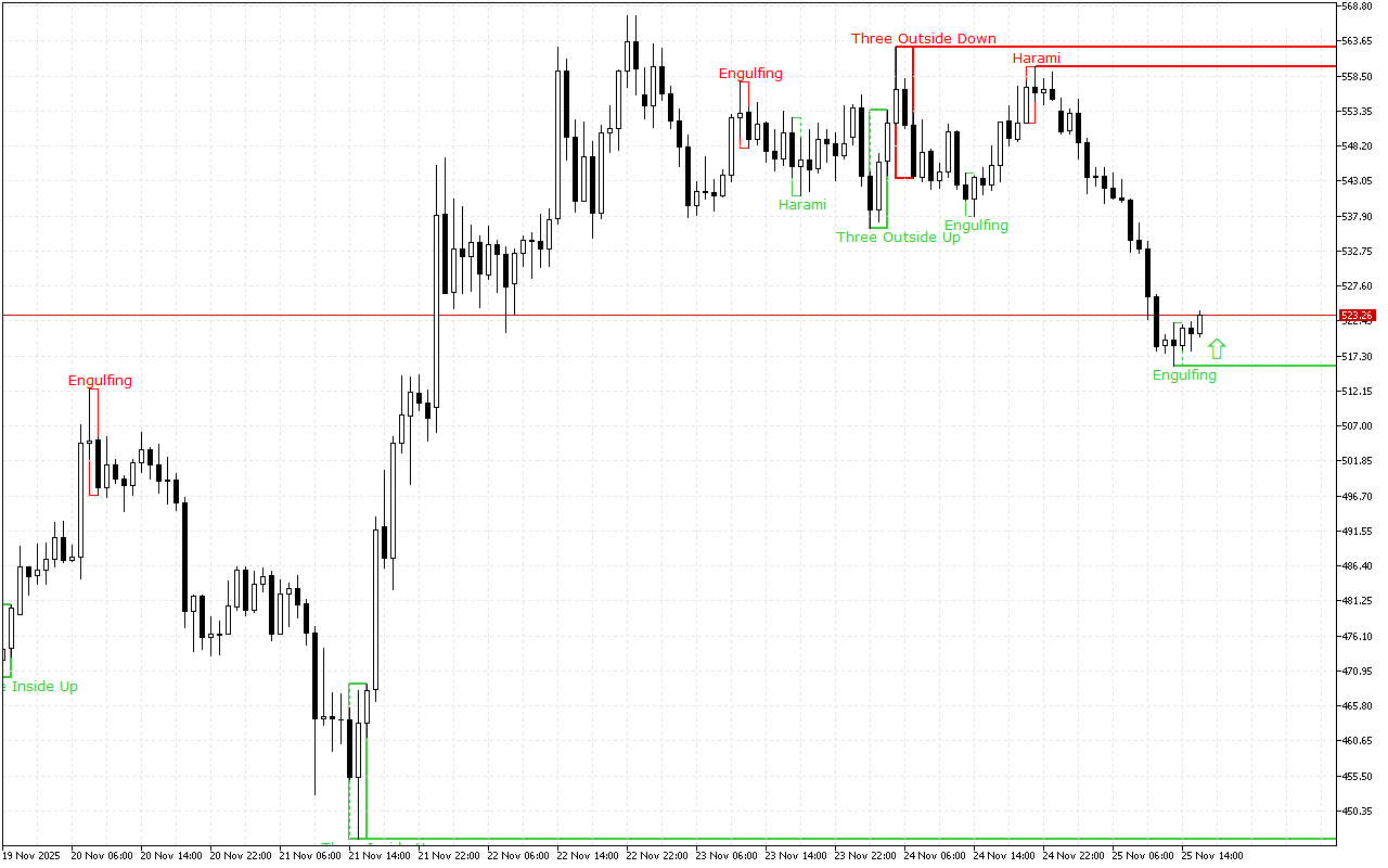 ระดับนี้เกิดขึ้นจากรูปแบบ Bullish Engulfing รูปแบบนี้ประกอบด้วยแท่งเทียน 2 แท่ง แท่งแรกอยู่ภายในตัวของแท่งที่สองซึ่งมีขนาดใหญ่กว่ามาก แท่งเทียนที่สองกลืนแท่งแรกจนหมด