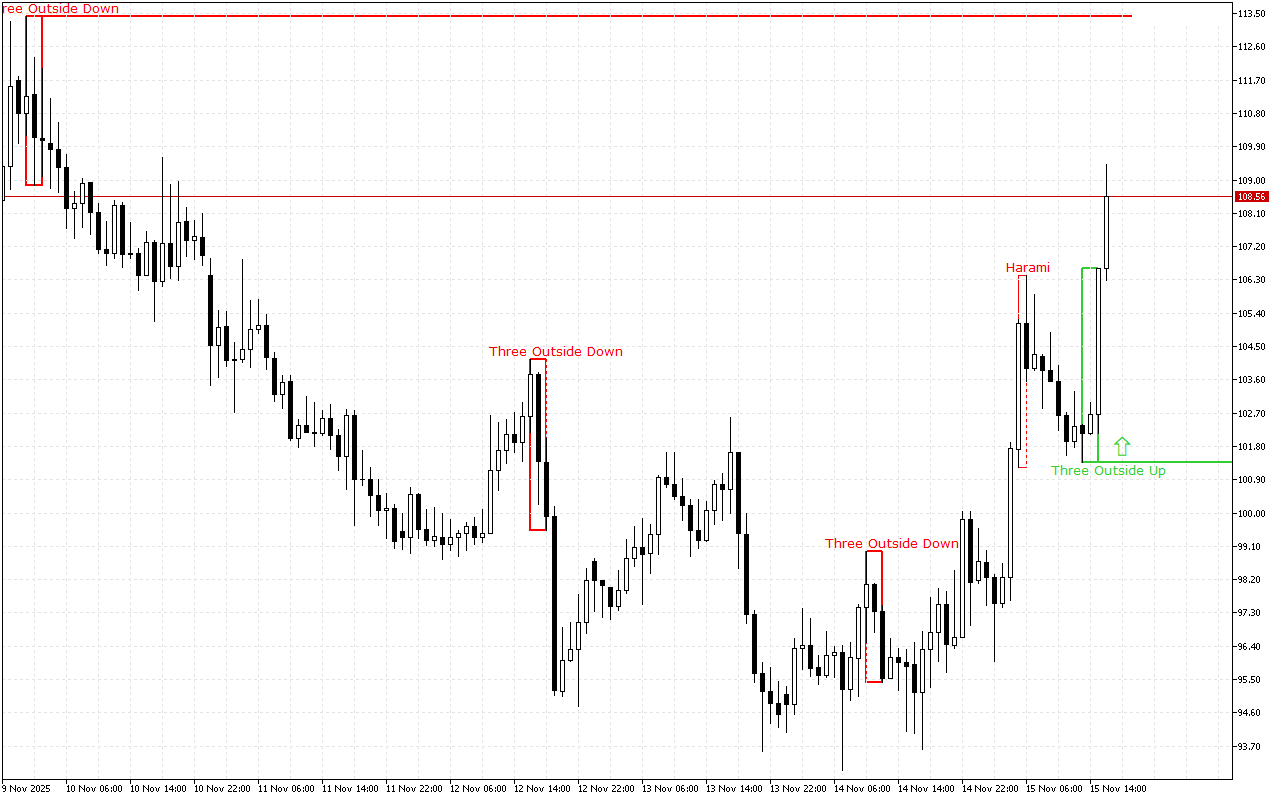 ระดับนี้เกิดจากรูปแบบ Three Outside Bars Up รูปแบบนี้ประกอบด้วยแท่งเทียนญี่ปุ่น 3 แท่ง แท่งเทียนแรกมีแท่งเทียนจริงสีดำสั้น แท่งเทียนที่สองมีแท่งเทียนจริงสีขาวยาวและกลืนแท่งเทียนแรกจนหมด และแท่งเทียนที่สามก็เป็นสีขาวเช่นกัน โดยปิดเหนือแท่งเทียนที่สอง